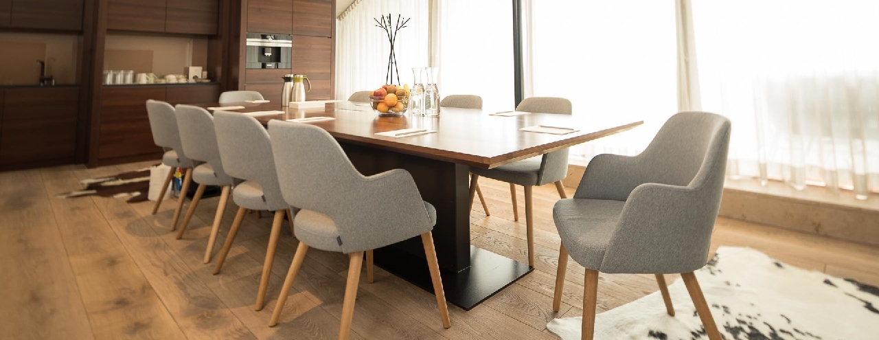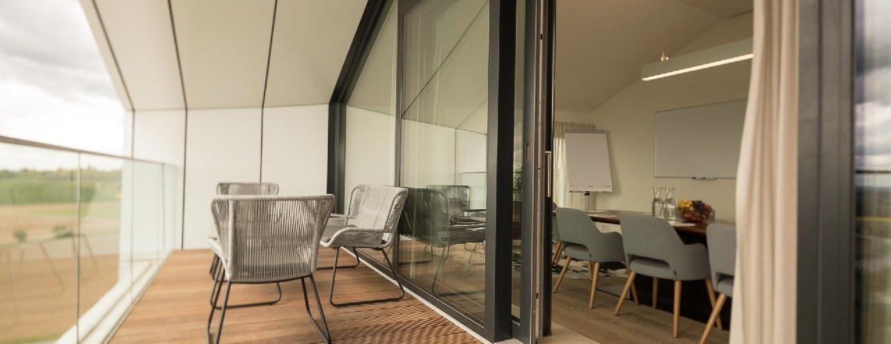Die bodentiefen Fenster dieser beiden Räume zeigen das natürliche Gesicht unseres Hotels. Die Räume bieten gleichzeitig Transparenz und Schutz und eignen sich hervorragend für unkonventionelle Workshops, kleine Meetings oder als Working-Spaces.