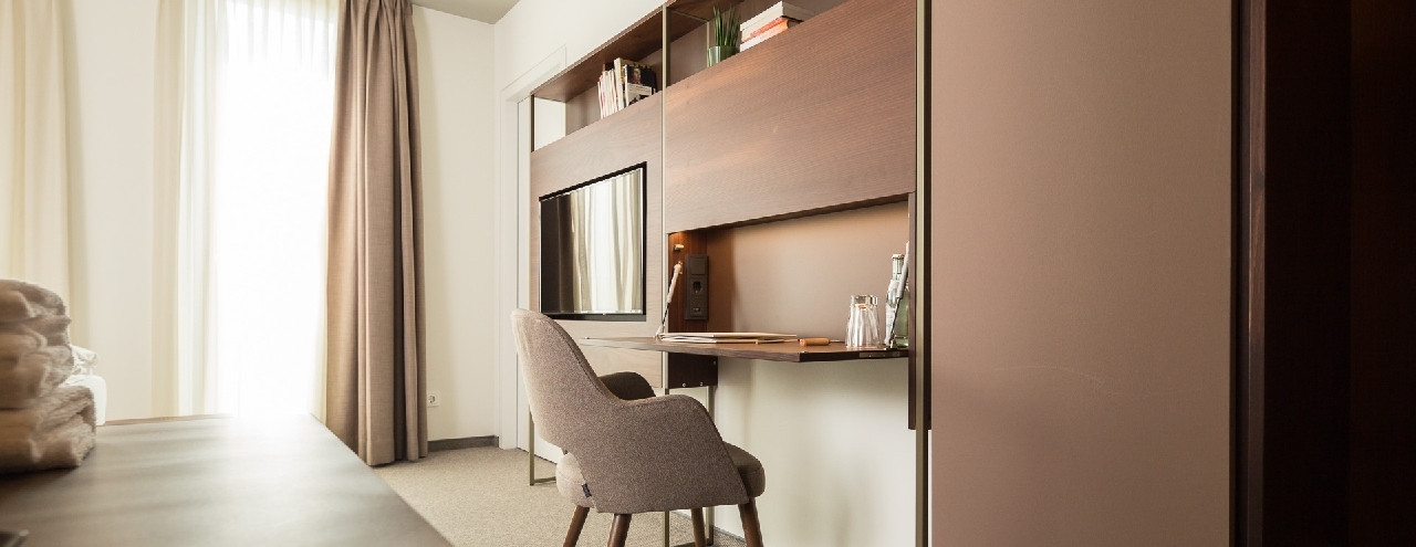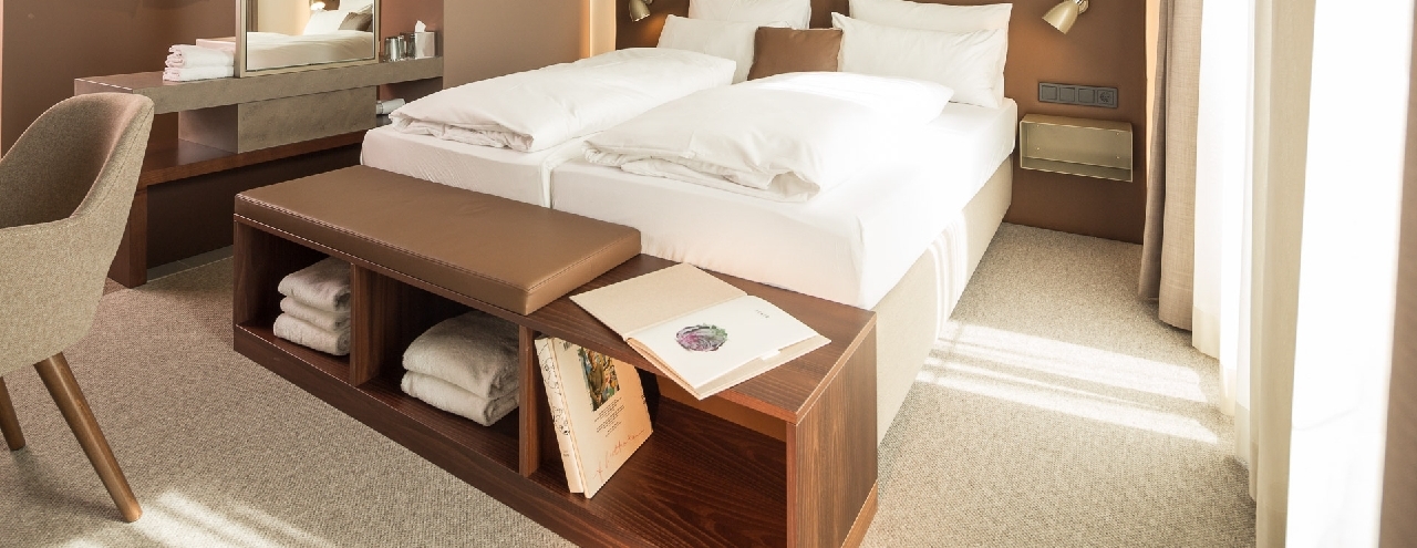 Edel und weich schimmert das Leder in unseren Gerber-Zimmern. Dazu bilden die kaffeebraune Wandfarbe und edles Holzmobiliar die perfekte Symbiose.